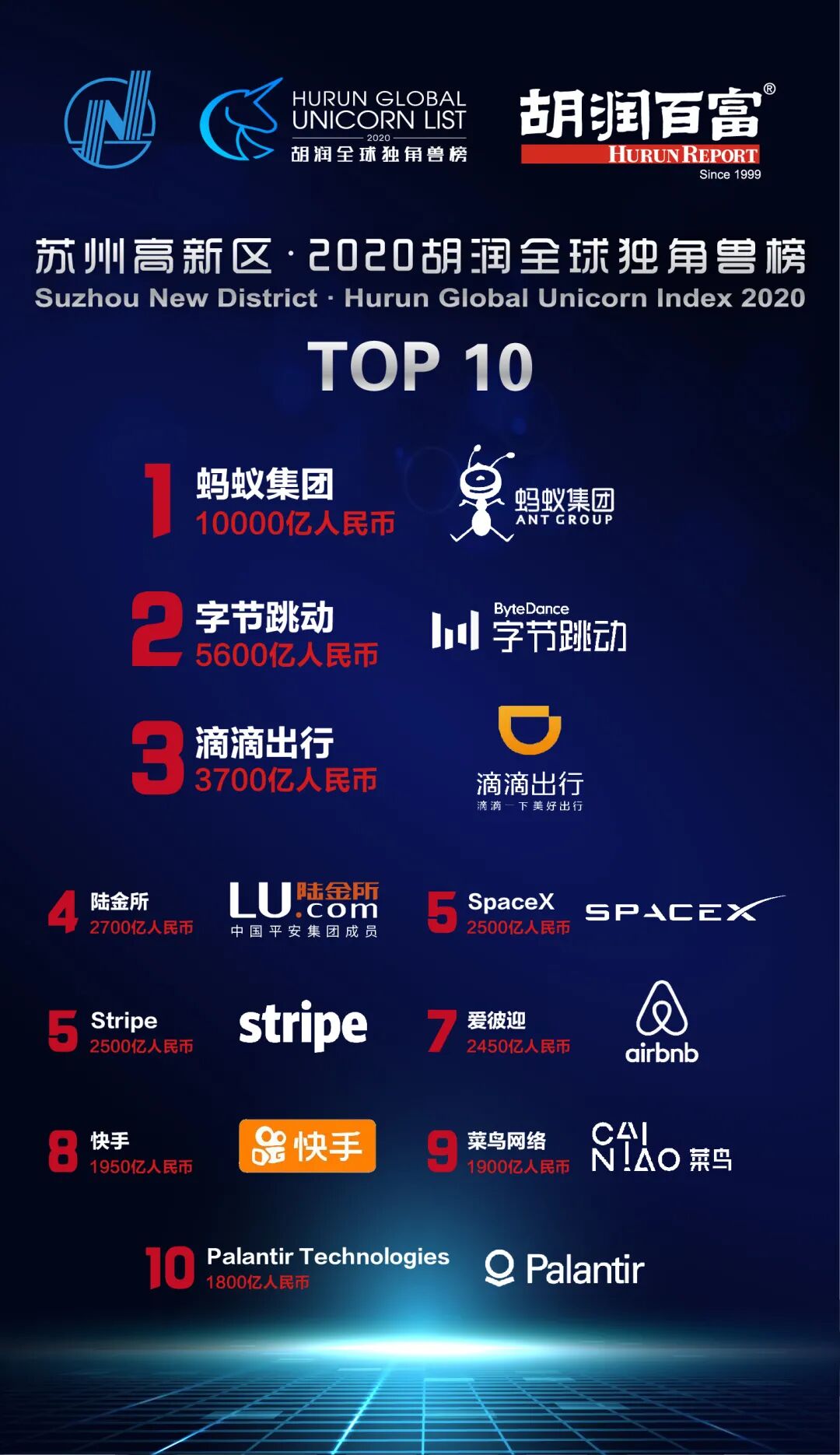 根据胡润研究院同苏州高新区最新发布的《2020胡润全球独角兽榜》,列出了全球范围内,成立于2000年之后,价值10亿美元以上的非上市公司,其中,蚂蚁集团以1万亿人民币的估值蝉联第一。