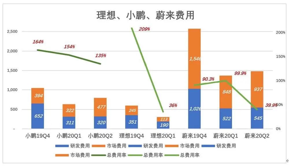 受疫情影响,2020年Q1交付数只有3838辆,环比降幅达53.3%,但总费用率还是被控制在100%以内。Q2交付数大增至1万辆以上,总费用率降到40%以下。主要原因是市场/行政费用从10亿元一线降到5亿多。