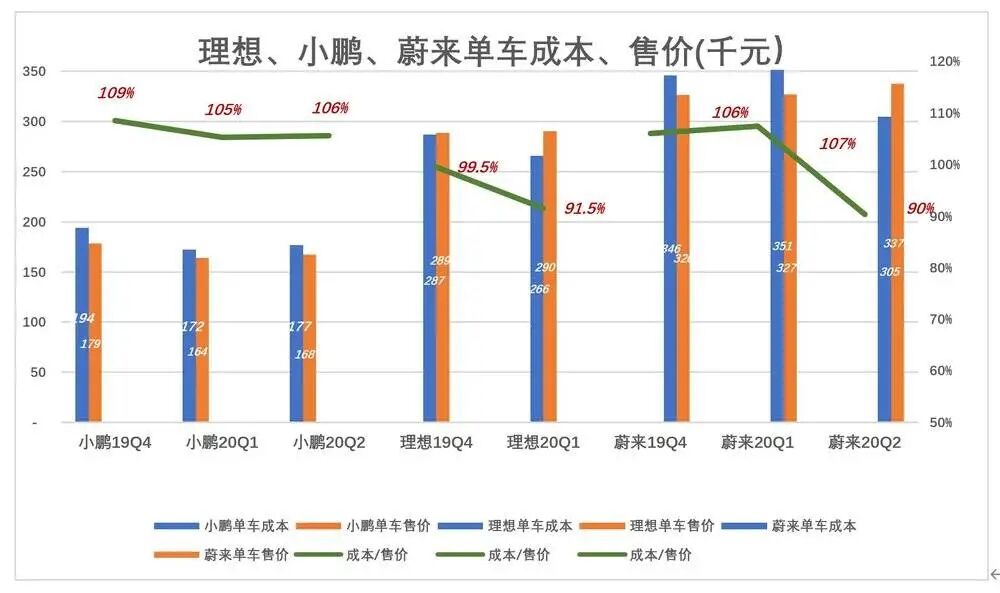 三家当中,小鹏成本、售价均为最低。2019年Q4单车成本19.4万(全部为G3车型),2020年Q1降至17.2万(全部为G3车型),Q2微微反弹到17.7万(90%为G3车型、10%为P7车型),可以推知P7成本为21.7万/辆。