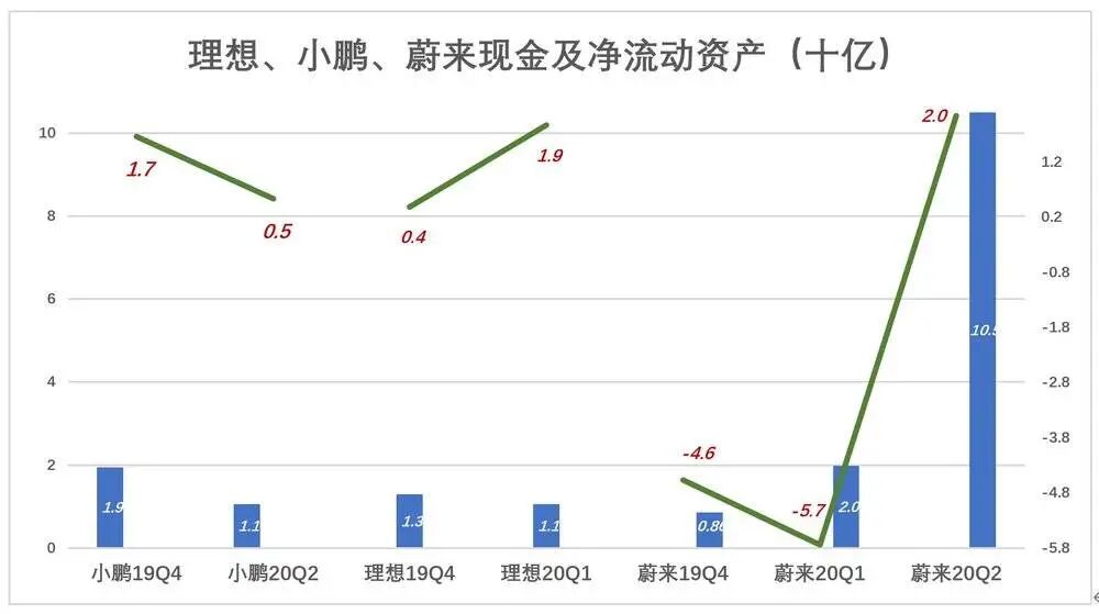 2020年6月末,蔚来净流动资产一举达到20亿。截至6月末,账面现金达105亿,较3月末增加85.2亿,其中包括2020年6月20日发行8280万新股募集的4.93亿美元。