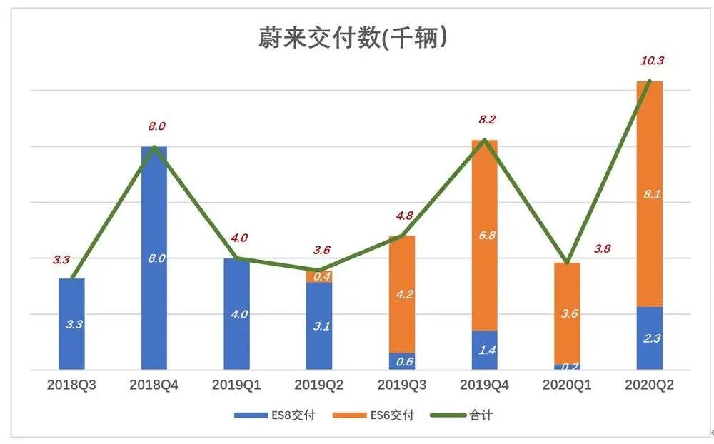 2020年Q2,蔚来ES8、ES6交付分别为2263辆、8063辆,季度交付首次突破1万辆。截至2020年6月末,蔚来旗下品牌累计交付逾4.6万辆(两款车型销量各占50%),累计销量领跑造车新势力。