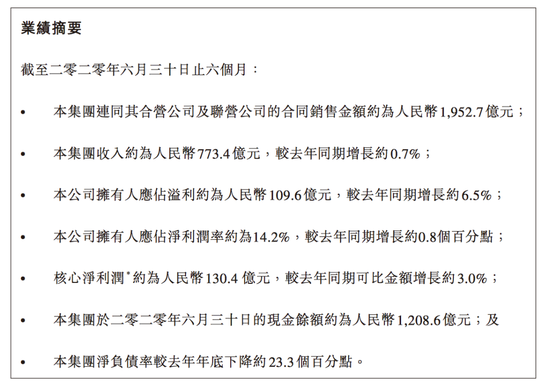 财务指标上,上半年,集团实现营业收入773.4亿元;毛利润约177.6亿元,核心净利润130.4亿元,同比提升3%;本公司拥有人应占溢利109.6亿,同比增长约6.5%;本公司拥有人应占净利润率约14.2%,同比增加80个基点。
