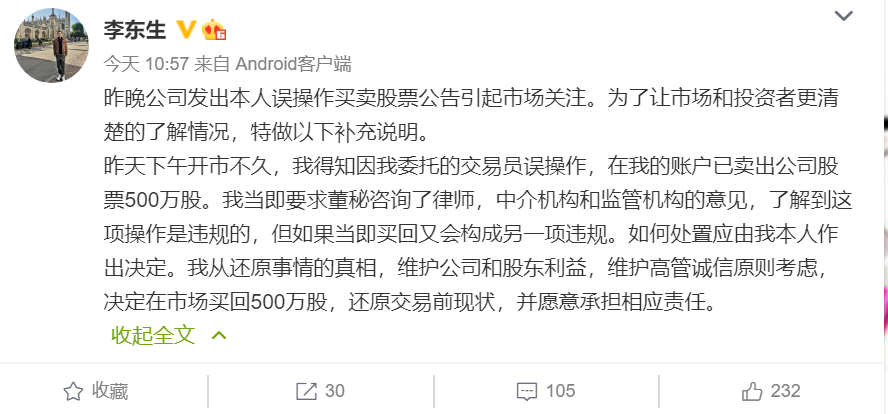 同时,TCL科技(000100.SZ)公告收到了公司大股东李东生《关于误操作TCL科技股票的致歉声明》。