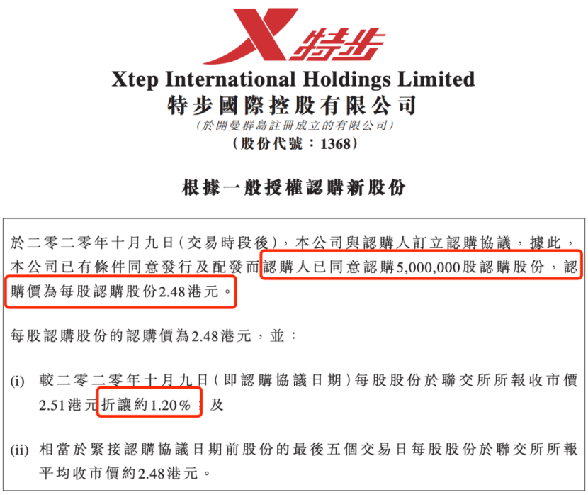 近日,港股上市公司特步国际(1368.HK)发布公告,代言人谢霆锋同意认购特步国际500万股股份,认购价为2.48港元/股,交易总额1240万港元(约合人民币1075万元)。此次认购价较当日收盘价折让约1.2%。