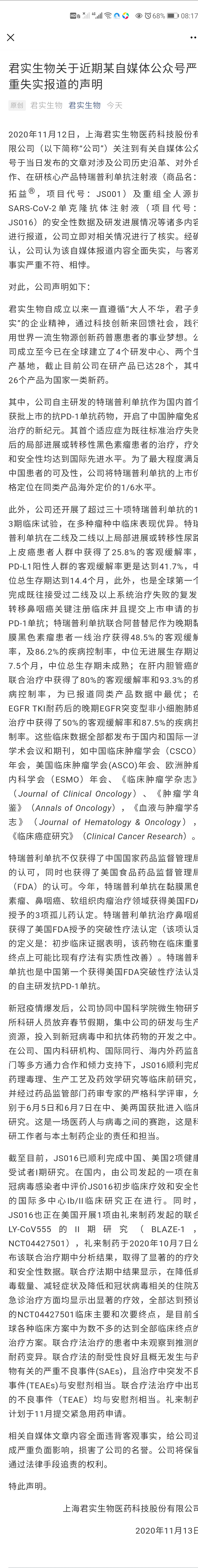 以下为君实生物回应全文:
