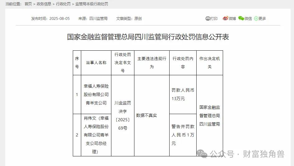 2025年8月5日,据国家金融监督管理总局四川监管局行政处罚信息公开表(川金监罚决字〔2025〕69号)显示,幸福人寿保险股份有限公司青羊支公司因“数据不真实”,被国家金融监督管理总局四川监管局罚款人民币13万元。