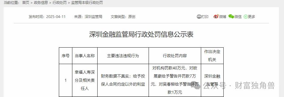 2025年4月11日,深圳金融监管局行政处罚信息公示表显示,幸福人寿深分及相关责任人因“财务数据不真实;给予投保人合同约定以外的利益”,深圳金融监管局对该机构罚款40万元。