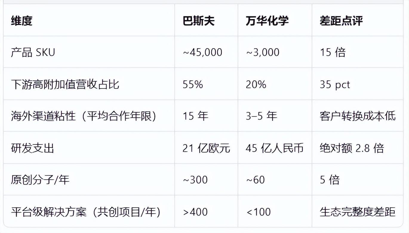 比如产品和研发方面,巴斯夫4.5万个SKU,覆盖涂料、香料、电池材料、农药、医药辅料、半导体化学品。而万华仅3千个左右,且45%营收仍集中在MDI/TDI/聚醚。
