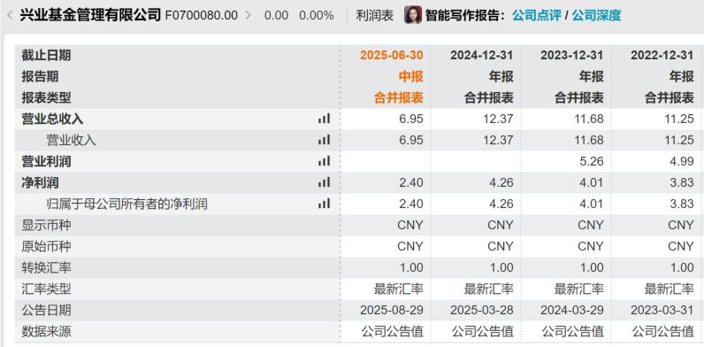 从经营数据看,兴业基金的业绩增长动力显露出疲态。虽然管理规模保持增长,但净利润迟迟未能突破2021年的高点。具体而言,2022年至2024年,兴业基金营业收入依次为11.25亿元、11.68亿元、12.37亿元,净利润依次为3.83亿元、4.01亿元、4.26亿元,增长幅度较为有限。2025年上半年实现营业收入6.95亿元,净利润2.4亿元,较上年同期分别上涨29.91%、43.71%,虽然增速明显提升,但净利润规模仍不及2021年同期的4.91亿元。这种“规模增、利润不增”的现象,在一定程度上反映了行业竞争加剧背景下管理费率的下降压力。