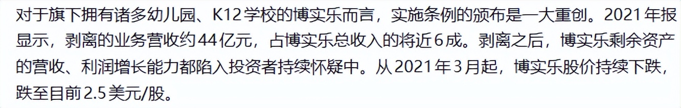 第二阶段是政策收紧期(2021年)。随着《民办教育促进法实施条例》修订完成,明确规定“不得通过兼并收购、协议控制等方式控制实施义务教育的民办学校”,直接冲击了博实乐的商业模式核心。据《新学说》等多个渠道报道,博实乐被迫剥离旗下多家幼儿园和双语学校,这些业务在2021财年贡献了约60%的营收。政策冲击立竿见影,股价从2021年初开始一路下行。
