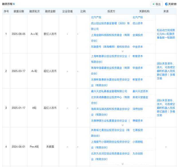 今年8月,松延动力刚刚完成数亿元A++轮融资,由金浦资本领投,北汽产投、中金资本、晶科能源、赟汇资本、优山资本、卓源资本、元智未来等机构跟投。今年3月,松延动力则连续完成过亿元A轮及A+轮融资。A+轮由彬复领投,华强资本跟投;A轮投资方包括神骐资本、北京未来科学城基金、天启资本、泽然资本、教育科技集团战略方等机构。
