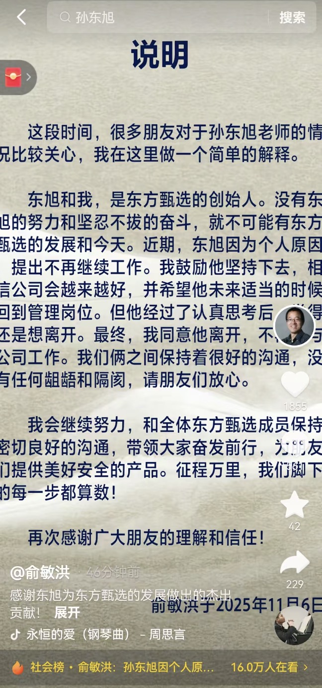 11月6日,新东方教育集团有限公司董事长俞敏洪发文确认孙东旭从东方甄选离职。