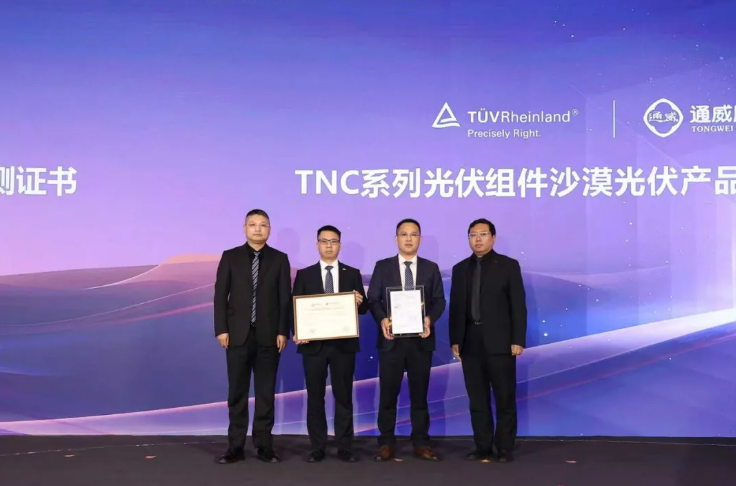 在颁证环节,通威TNC 3.0组件凭借出色的性能和质量,荣获TüV北德 IEC61215 & IEC61730认证证书、TüV南德抗阴影遮挡A级认证证书。同时,TNC系列组件还荣获CPVT沙戈荒场景耐候性“国品优选”检测证书、TüV莱茵沙漠光伏认证证书。