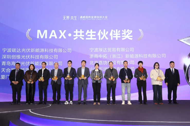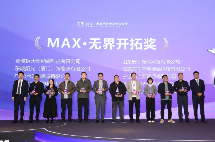 大会现场,公司还向来自全国的30家合作伙伴颁发了“MAX·无界开拓奖”“MAX·共生伙伴奖”殊荣,通威股份总裁助理、通威太阳能科技总经理萧圣义,通威股份人力资源总监易继成,通威股份行政总监、工会主席冯畅,通威股份营销副总裁薛青松,通威股份光伏商务部组件营销分布式业务负责人孙志杨、分布式组件渠道兼华东业务负责人郭佳迅代表公司颁奖,以感谢合作伙伴长期以来的鼎力支持与精诚合作。