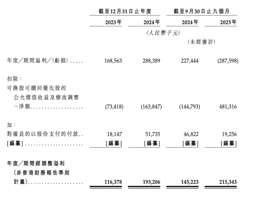 但若扣除可换股可赎回优先股的公允价值变动等非经营性影响,其年度╱期间经调整溢利 (非香港财务报告准则计量 )则分别为1.16亿元、1.93亿元和2.15亿元,2024年和2025年前三季同比增速依然高达66.38%和48.28%。
