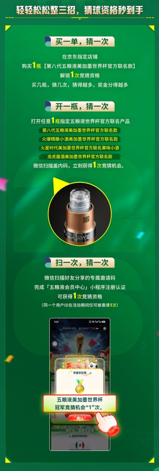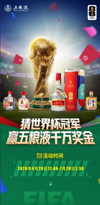 4月20日起,作为FIFA美加墨世界杯官方联名白酒,五粮液重磅上线“猜世界杯冠军,赢五粮液千万奖金”主题活动。1000万元现金奖池、三轮接力分奖、零门槛社交互动……与此同时,五粮液美加墨世界杯胜利小酒礼盒正式登陆山姆会员商店,开启全球独家首发。