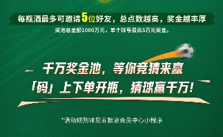 活动自4月20日启动,设下三轮递进式奖金池:第一轮“小组出线”瓜分200万元,第二轮“晋级8强”再分300万元,终极轮“夺冠之战”500万元,累计1000万元现金。从“规模红利”到“价值红利”,五粮液以“消费者主权”构建产业新逻辑